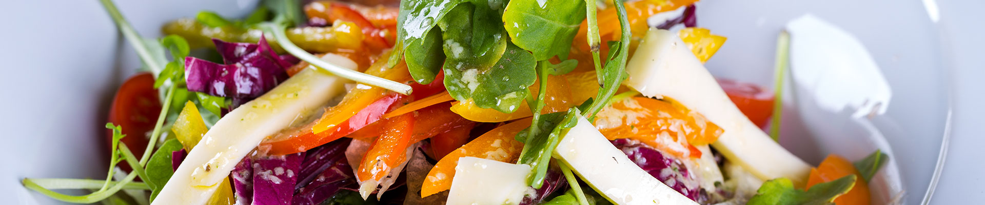 (Sallatë, tomatini, tranguj, speca tricolore, ullinj, mozzarella, salcë dresing, misër, qepë e kuqe)